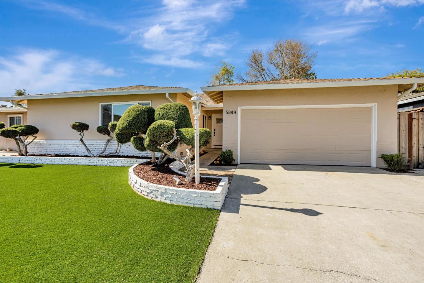 Welcome to 5849 Bridle Way, a beautifully remodeled, east-facing home in the heart of Blossom Valley. This single-story residence offers a spacious and functional floor plan with four bedrooms and two bathrooms. The large primary suite features an ensuite bathroom, while the junior primary bedroom boasts a walk-in closet and a Jack-and-Jill bathroom with a double vanity. The open kitchen is the heart of the home, showcasing custom cabinetry, quartz countertops, modern appliances, an eat-in counter, and a cozy breakfast nook. Sunlight pours into the living room through a large picture window, offering peaceful backyard views. A separate family room, complete with a fireplace, built-ins, and sliding door access to the backyard, provides the perfect space for relaxation and gatherings. Step outside to a spacious, covered patio ideal for entertaining. Recent upgrades include a remodeled kitchen, wide-plank flooring, recessed lighting, fresh interior paint, an epoxy garage floor, and more. Move-in ready, this home is waiting for you to make it your own!