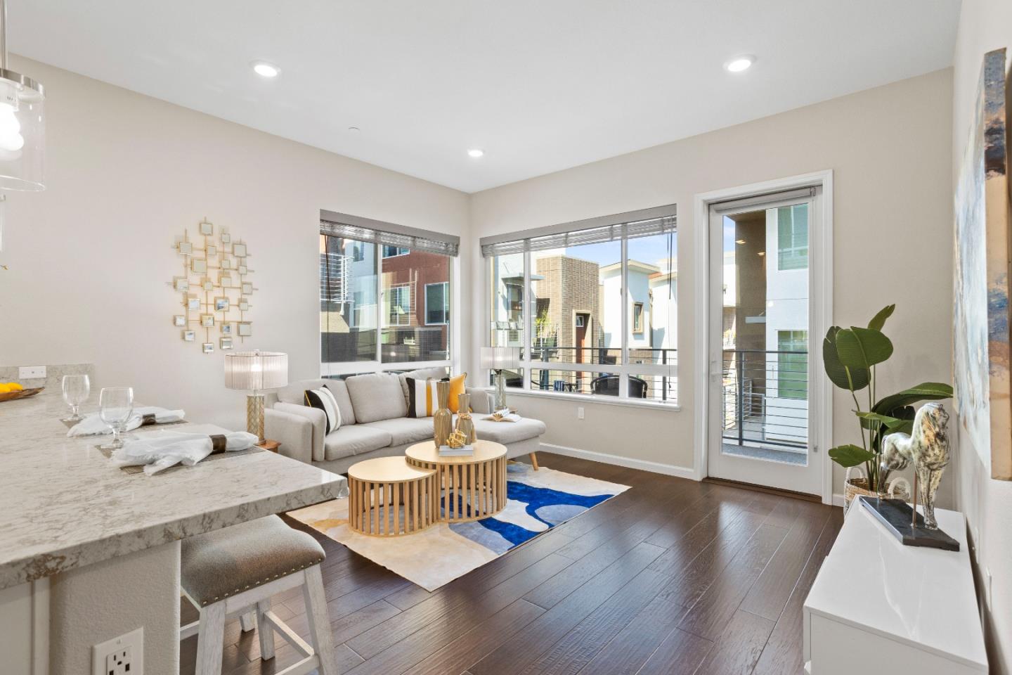 Welcome to sophisticated urban living in one of the most sought-after neighborhoods. This stunning one-story corner unit blends modern luxury with everyday comfort. Vaulted ceilings and expansive windows fill the open 3-bed, 2-bath home with natural light. The gourmet kitchen features granite countertops, a large center island, ample cabinetry, and premium stainless steel appliances, including a gas cooktop. The open living and dining area flows seamlessly to a private balcony, perfect for relaxation. The Sky Terrace rooftop garden offers panoramic mountain views, a BBQ area, and lounge spaces ideal for entertaining. Additional highlights include SMART-controlled appliances, a private 2-car garage for secure parking and extra storage, plus an included refrigerator, washer, and dryer. Situated in the heart of Silicon Valley, this prime location puts you minutes from major highways, downtown San Jose, San Jose State University, Caltrain, Light Rail, and corporate shuttles. Enjoy nearby parks, top-rated schools, shopping, dining, and entertainment. Experience modern luxury, breathtaking views, and unbeatable convenienceyour dream home awaits!