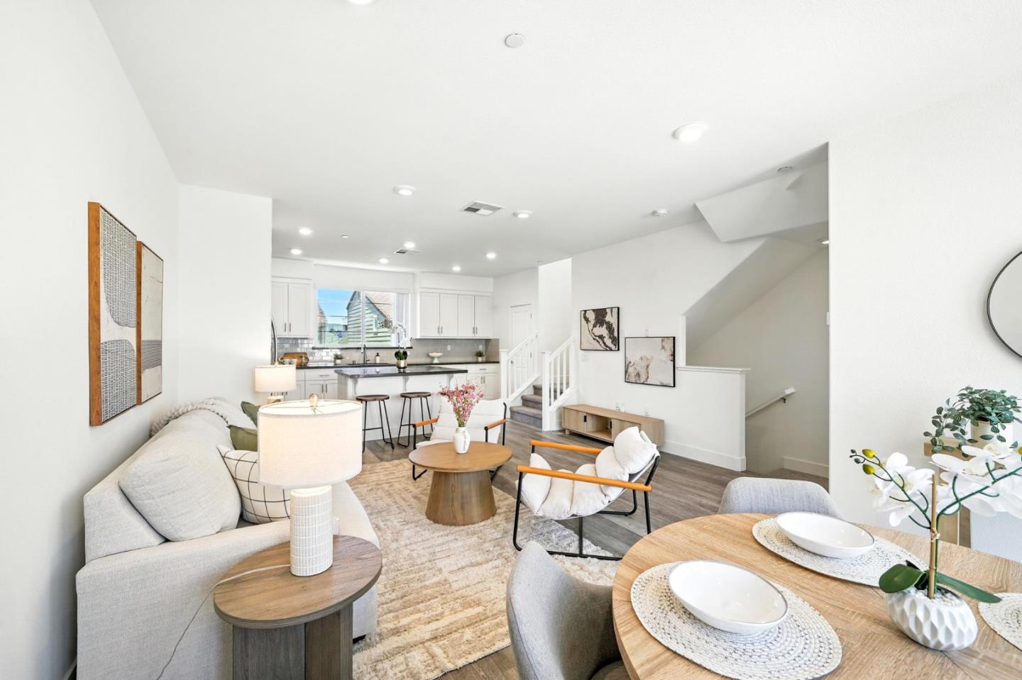 Welcome to 29341 Hub Ct, a 2-bedroom, 2.5-bathroom, 3 story townhome in the SoHay Community of Hayward. Built in 2020 this 1,304 sqft residence offers a bright, open floor plan with stylish laminate and tile flooring throughout. The modern kitchen is equipped with stone countertops, a large central island, stainless steel appliances including a gas range, microwave, refrigerator, and dishwasher, plus a walk-in pantry for added storage. Upstairs, the spacious primary suite features a spacious closet and en-suite bathroom with dual sinks and an oversized stall shower. The convenient upper-level stacked laundry area adds functionality, while central AC and forced air heating ensure year-round comfort. Energy-efficient HOA solar panels help lower utility costs, and the attached 2-car garage provides secure parking and extra storage. Nicely manicured courtyard areas and nearby walking paths lead to the newly build SoHay Park with 2 play grounds, picnic areas, and basketball courts. Close to BART, shopping, dining, parks, and major commute routes, this home blends modern convenience in a desirable neighborhood. Low monthly HOA of $329 covers exterior and roof maintenance, HOA Solar Panels (Significantly reduces your electric bill!), common area maintenance, and insurance.