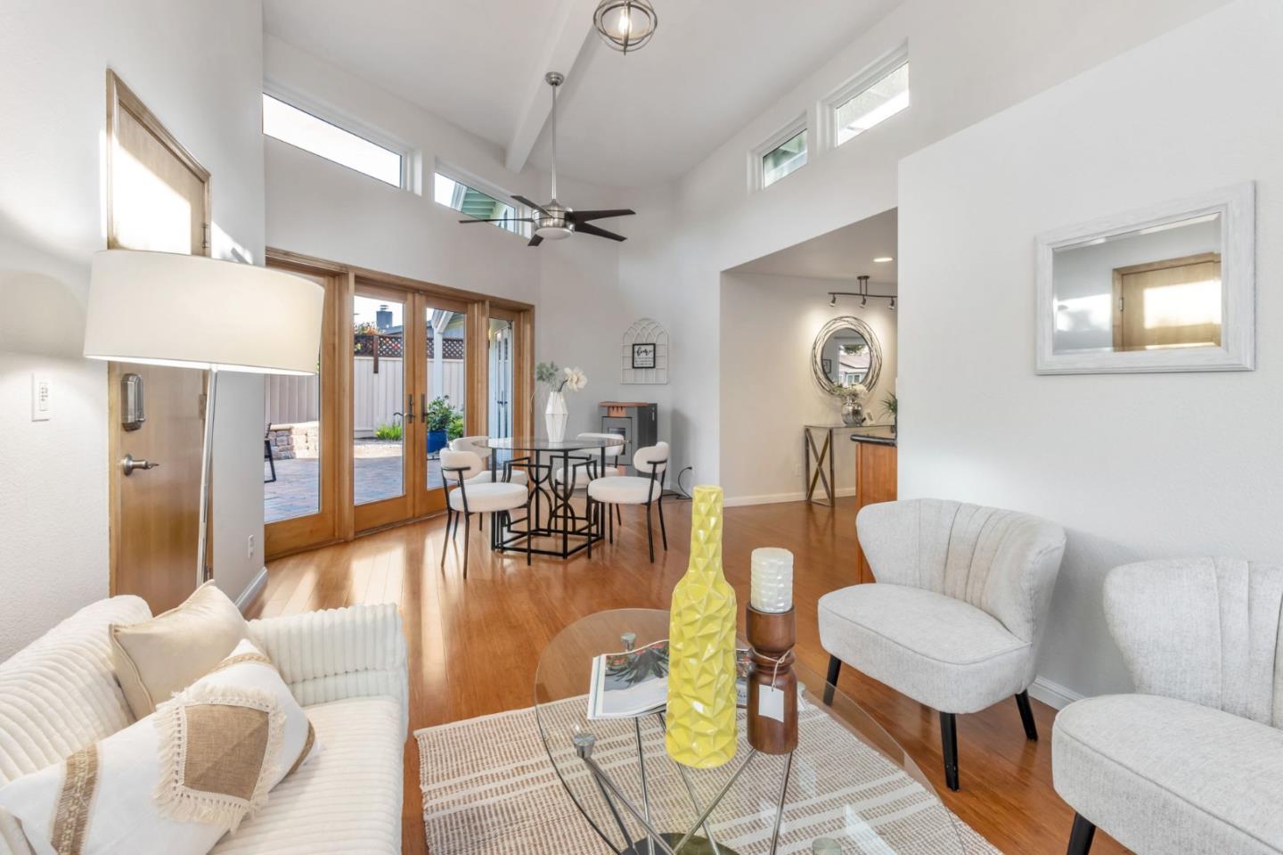 This 3-bedroom, 2-bath Sunnyvale home was renovated in 2009 & expanded to 1,499 sq ft with a focus on sustainability, water & energy conservation. The kitchen offers Bosch stainless steel appliances, including an induction stove, granite countertops, cherry cabinets, a breakfast bar, & cork flooring, and the kitchen & family room are heated by an Astroflame Rika pellet stove. The primary suite features 15-foot ceilings, two loft spaces, oak French doors to the backyard, mirrored closet doors, & a ceiling fan. The primary bath includes a marble walk-in shower with two shower heads, a maple vanity, & heated marble flooring. Bamboo flooring, Anderson dual-pane windows, soaring ceilings, & two tube skylights fill the home with natural light. Solar panels, tankless water heater, cistern-fed irrigation, & efficient heating systems all help keep utility bills low. The backyard features a paver patio, a curved sitting wall, a flagstone walkway, & a fruiting orange tree. Located near Fair Oaks Park, the Magical Bridge Playground, Columbia Middle School's public pool, little library boxes, & daycares including two Chinese immersion & one Spanish immersion. Downtown Sunnyvale, Caltrain, & San Jose Airport are all close by, as is quick access to 237, 101, Central & Lawrence Expressways.