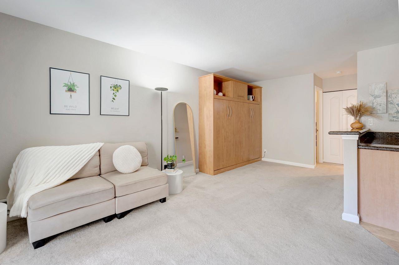 Welcome to Baywood Villas, where comfort and convenience come together in this bright second-floor studio - perfect for first-time buyers, young professionals, or couples. The open layout features a Murphy bed that fits a queen-size mattress, maximizing flexibility. The space is perfect for entertaining, comfortably fitting a couch and guest seating while still allowing room for a desk - ideal for students or remote workers. The kitchen boasts stainless steel appliances, granite countertops, and a pantry closet, while the full bath includes a tub and a nearby linen closet. Ample storage includes a walk-in closet and a patio storage closet. Step onto the private balcony to enjoy lush green views - the perfect spot for morning coffee or unwinding at day's end. Baywood Villas includes a pool, spa, gym, playground, and clubhouse with a kitchen, fostering a vibrant community. The HOA covers water, trash, hazard insurance, and exterior maintenance for hassle-free ownership. With assigned carport parking and ample guest spaces, accessibility is a breeze. Close to dining, shopping, Quarry Lake, BART, and major routes, this condo keeps you connected to the best of the Bay Area. Dont miss this incredible opportunity - make it yours today!