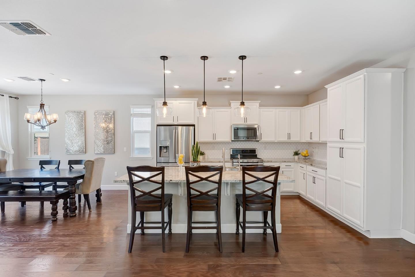 Welcome to the perfect blend of style, space, and community in the heart of Gilroy! This stunning newer-construction home is better than brand new, thoughtfully upgraded and move-in ready, with all the designer touches already in place. Step inside and be greeted by soaring ceilings, a light-filled open floor plan, and modern finishes that feel both elevated and inviting. The heart of the home is the kitchen, featuring crisp white shaker cabinets, sleek quartz countertops, stylish pendant lighting, and a spacious island perfect for entertaining or everyday living. A highly desirable first-floor bedroom and full bathroom make this home ideal for multi-generational living, guests, or a private home office setup also featuring an additional bonus room on the first floor, offering flexibility and convenience thats hard to find. Upstairs, you'll find a generous loft area perfect for a second living space, playroom, or media room. Whether you're working from home or looking for that extra space, this home delivers. Located in one of Gilroy's most sought-after communities, you'll enjoy tree-lined streets, nearby parks, and a warm neighborhood feel all with easy access to shopping, dining, Gilroy golf course, and top commuter routes.