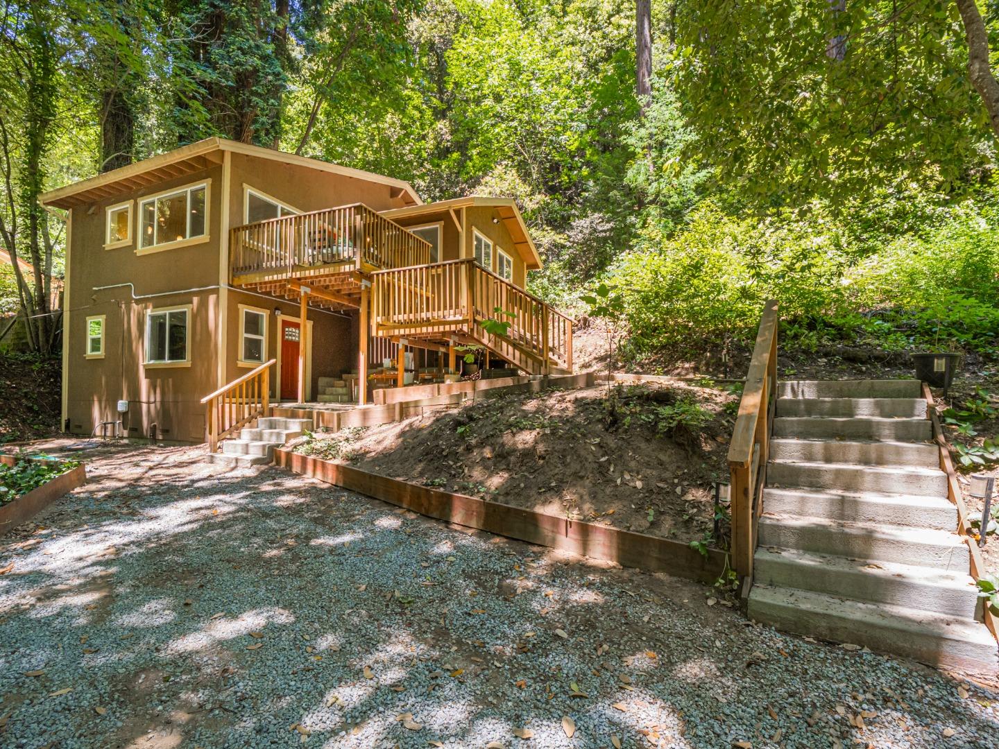 Nestled in a desirable Felton neighborhood just off Redwood Drive, this beautifully updated, move-in ready home offers the best of Santa Cruz mountain living, just minutes from the quaint shops and restaurants of downtown Felton, and the magic of Henry Cowell State Park. This enchanting home features an additional office/bonus room with a separate entrance, offering flexible space for a third bedroom, guest quarters, or home office. Inside, you'll find a large kitchen with pretty granite countertops, stainless steel appliances, and gorgeous wood flooring. Vaulted ceilings enhance the sense of space and the thoughtfully designed layout offers both comfort and functionality. Surrounded by majestic redwood trees and natural beauty, the property offers serenity and privacy, with a charming deck that's perfect for morning coffee or quiet evenings under the stars. Included in the sale are three parcels totaling a full 1.28 acres, offering so many possibilities. Whether you dream of building an ADU, creating gardens, or designing a workshop, there's ample space to explore your vision and make it your own. All of the peace and quiet one can desire, yet minutes from all amenities.