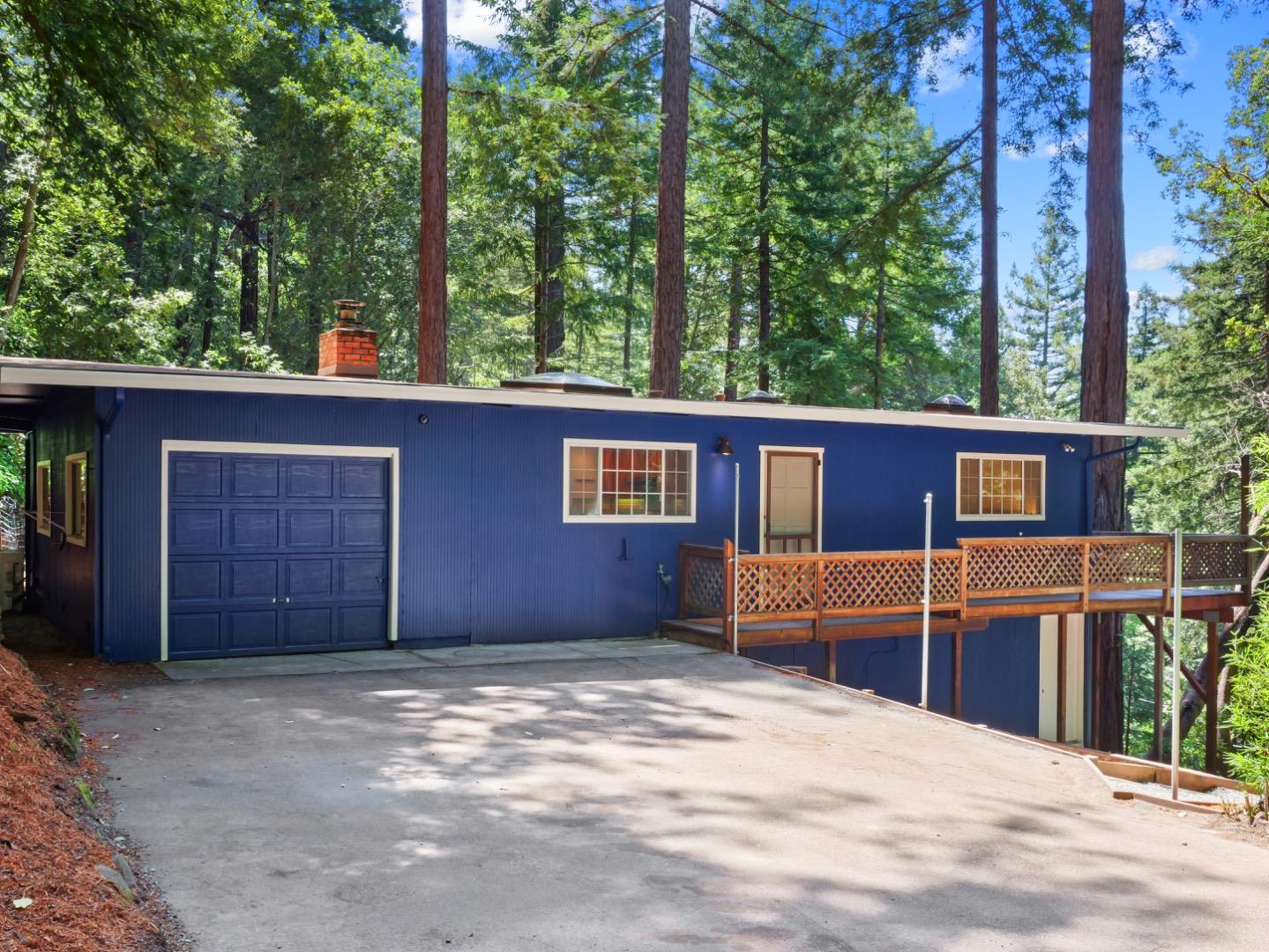 Located in the majestic redwoods of Felton, 11660 Edgewood Dr is a peaceful mountain retreat offering unmatched privacy, scenic views, and a rare sense of tranquility. Set on a double lot, this 2-bedroom, 1-bathroom home features 770 sq ft on a single level of thoughtfully designed living space with a cozy and inviting layout that is easy to maintain. Inside, you will find a charming wood-burning fireplace, laminate flooring, quartz kitchen countertops, and skylights that invite in natural light and warmth. Expansive balconies run the length of the home; perfect for enjoying your morning coffee among the trees or gathering with friends for sunset views. Enjoy the redwood grove situated at the front of this property, contributing to the surrounding peaceful environment of the home The attached garage and generous parking area provide room for guests, recreational vehicles, or additional storage. Whether you're cozying up by the fire or heading out for a day of hiking and biking, this home invites you to slow down and embrace nature. Loch Lomond and local parks are minutes away, with convenient access to Santa Cruz and Silicon Valley. Sale includes additional parcel, APN#075-351-07
