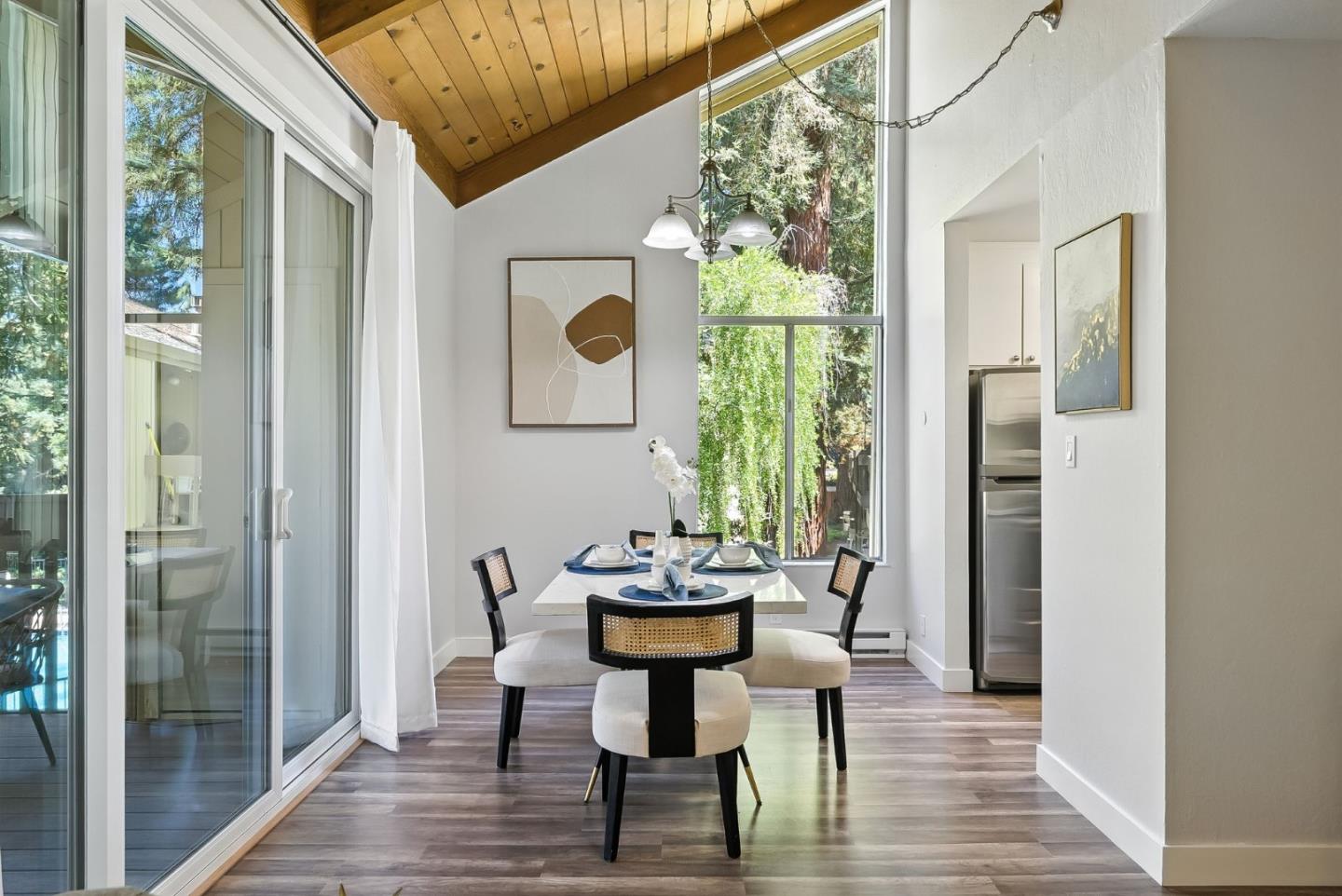 Discover the ideal combination of a peaceful retreat and proximity to a vibrant downtown in the heart of Mountain View. This beautifully updated top-floor end unit one-bedroom, one-bathroom condo offers approximately 784 square feet of stylish living. The open living area, anchored by a classic fireplace and enhanced by soaring high ceilings, flows out to a private balcony with relaxing pool views. The modern kitchen is a delight with quartz countertops and abundant storage, and a large pantry. The oversized bedroom provides a peaceful retreat, while the updated bathroom showcases sleek finishes with a large vanity. The Cypress Point Lakes community is an oasis. Stay active with two swimming pools, a fitness center, and tennis courts, or unwind in the community spa. With multiple on-site laundry rooms, lush grounds, and an included covered parking space, every convenience is considered. Just minutes away from MV Caltrain station, and major tech hubs like Google, Meta, and Apple, making your commute effortless. This is a rare opportunity to own a peaceful top-floor end unit home with direct access to Silicon Valleys best dining and transportation hubs.