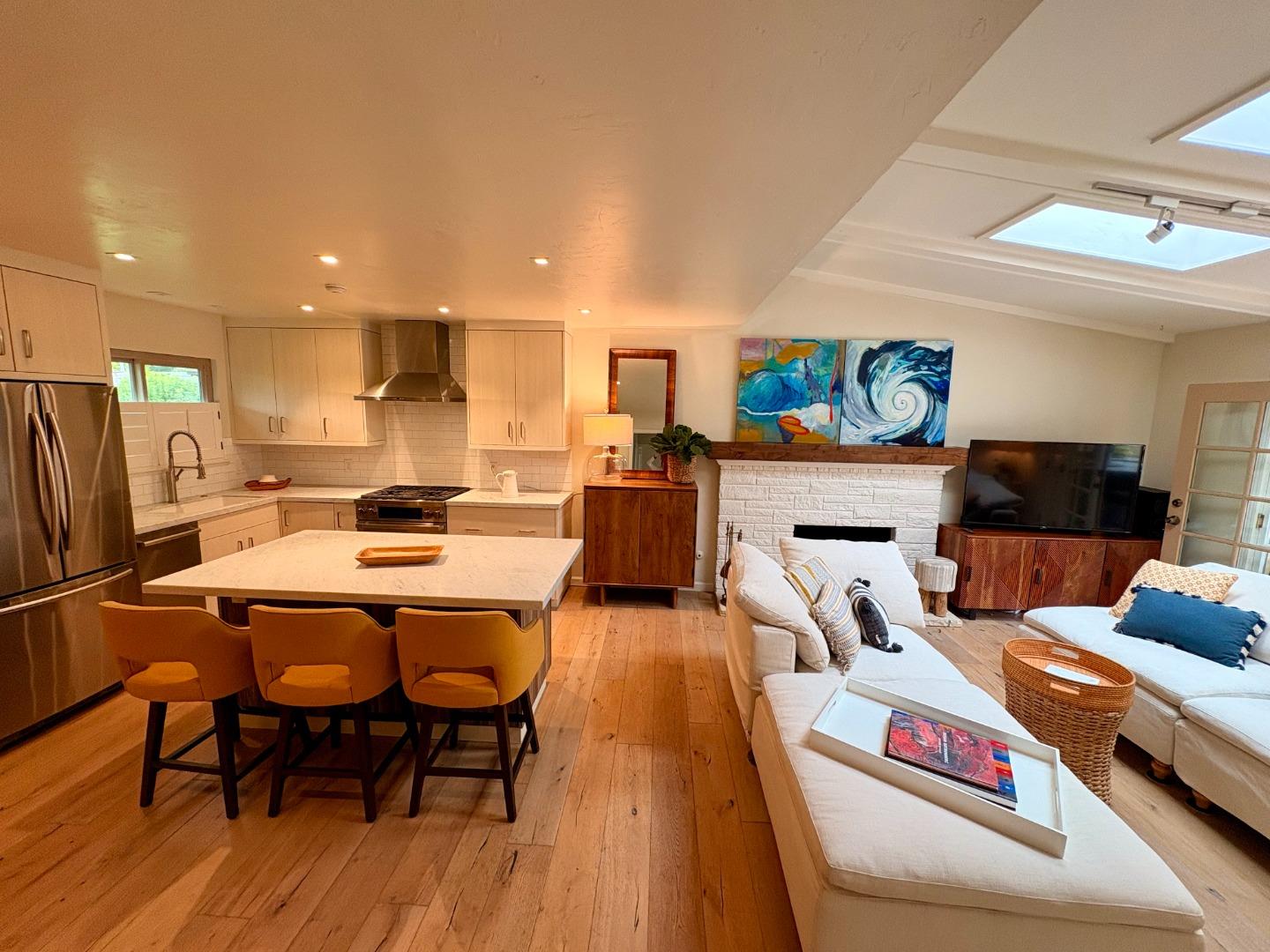 Best location, end unit on the south berm of Hacienda Carmel with an expanded stone terrace surrounded by lush greenery and scenic mountain views. This 2/2 residence offers an reimagined, updated layout with a new open concept kitchen, custom cabinets, California Classics French Oak engineered wood flooring, new Envi brand zone heating, and numerous skylights. The kitchen design is a chef's delight with a large Carrara marble dining island and countertops plus high-end appliances including a gas oven and cooktop, dishwasher, microwave, and French Door refrigerator. This home is modern, bright, and airy, while the California shutters and cozy gas fireplace both add warmth and character. Come enjoy the planned community of Hacienda Carmel with over a mile of walking paths, bookmarked by community gardens, a pool, clubhouse, library, restaurant, gym and dog run. This over-55 community in Carmel, CA, spans over 50 acres adjacent to Palo Corona Regional Park. a perfect spot for avid hikers.