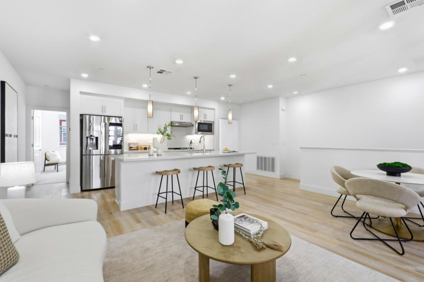 Welcome to this beautifully upgraded 5-year-new SummerHill Homes townhome in Santa Claras sought-after Neuvo community. The bright, open main level features a chef-inspired kitchen with quartz slab countertops, an oversized island, soft-close cabinetry, and a premium GE Profile stainless steel appliance suite flowing into spacious living and dining areas and out to a private balcony. Contemporary finishes include soaring ceilings, European white oak hardwood floors, and recessed LED lighting. Two generous en-suite bedrooms offer ideal flexibility, including a serene primary suite with custom vanities and enhanced privacy touches. Thoughtful upgrades include a Nest thermostat, CAT6 wiring, R-11 sound-reducing insulation, in-unit laundry, and a finished EV-ready 2-car garage. Enjoy low Santa Clara utilities and resort-style amenities - clubhouse, playground, basketball court, dog park, and picnic areas - plus the unique Bookmobile advantage, with the Santa Clara City Library making weekly scheduled stops right within the community for ultimate convenience - just minutes to Costco, Whole Foods, Lawrence Caltrain, major tech campuses (NVIDIA, Apple, Google, Meta), and easy freeway access for effortless commuting.