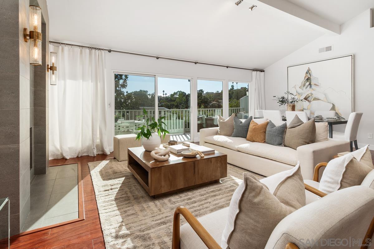 This beautifully remodeled, end-unit CX Model in Mount La Jolla is awaiting its new owners! Inside, you’re welcomed by warm wood floors, and a freshly painted, light-filled interior. Ideally designed for entertaining, the expansive living room is highlighted by a voluminous vaulted ceiling, impressive fireplace, wet bar, and sprawling deck spanning the length of the room with a retractable awning. Whipping up your favorite meal is easy in the stunning chef’s kitchen featuring a skylight, abundant custom cabinetry, and 180 bottle dual zone wine refrigerator. Each of the 3 generously sized bedrooms are en suite, one of which conveniently offers a loft/office area. Privacy abounds in the tranquil, fully fenced backyard boasting artificial turf, a southern orientation, and a spacious covered patio. Some notable features and upgrades: redesigned lower level, remodeled fireplace, kitchen and bathrooms, newer furnace and AC (6-2022), a wood and iron staircase, security system, and a finished garage with built-in cabi