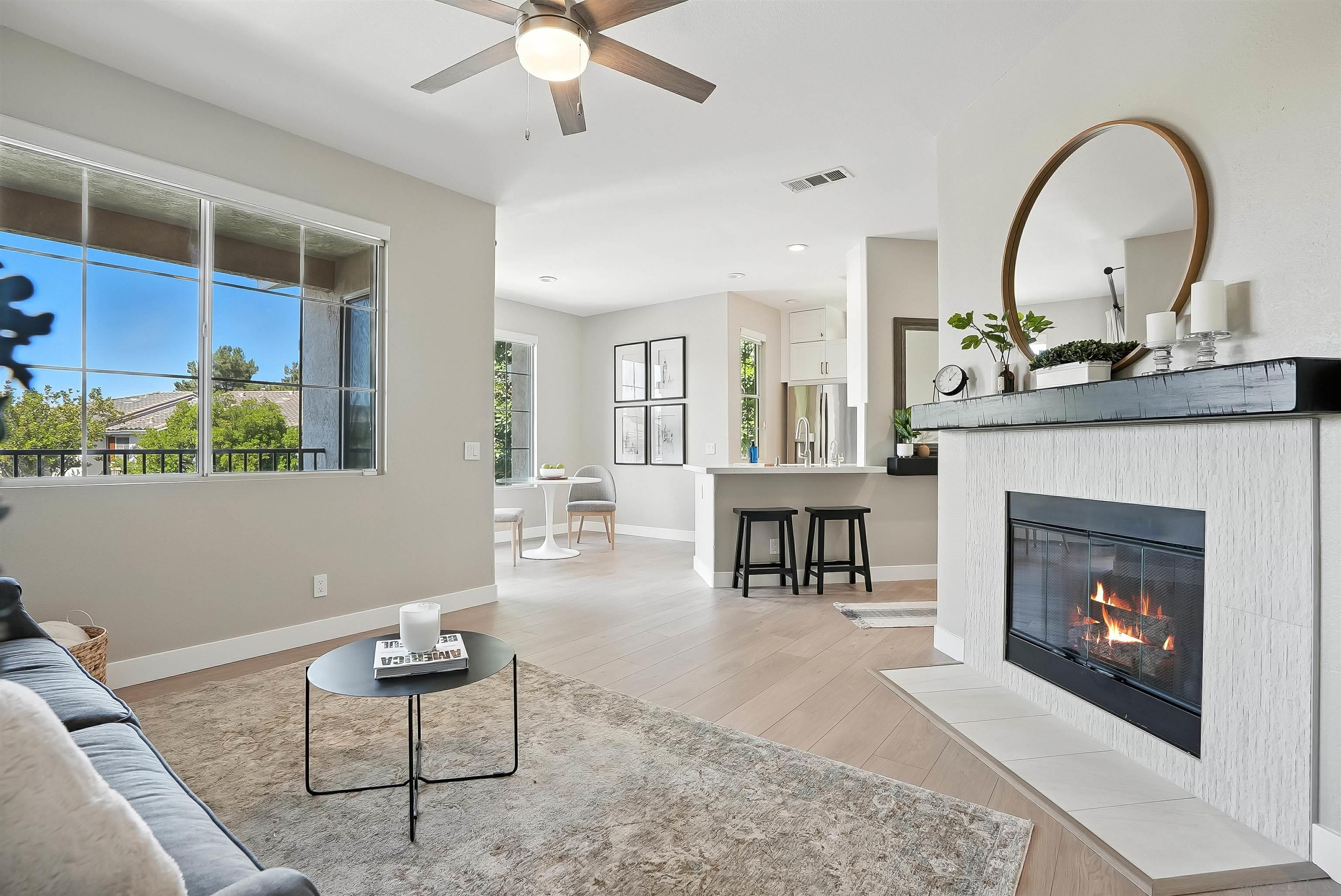 Welcome to 10728 Sabre Hill Dr, Unit 240, located in the desirable Palo Alto community of Sabre Springs, within the award-winning Poway Unified School District. This beautifully remodeled 2-bedroom, 2-bath condo offers modern upgrades, smart home features, and a prime location with easy access to I-15, State Route 56, and convenient carpool lanes. The kitchen has been tastefully updated with white stacked shaker cabinetry, soft-close drawers, quartz countertops, a ceramic tile backsplash, deep basin sink, Insta-hot filtered water, under cabinet lighting, and stainless-steel appliances including a 5-burner gas stove and side-by-side refrigerator. Throughout the home, enjoy luxury vinyl flooring with QuietWalk cork-foam underlay, LED recessed lighting, chair rail accents, and fresh paint. The open floor plan offers excellent natural light and a cozy, stone-accented fireplace with a mantle. Both bathrooms have been thoughtfully updated with new vanities, comfort-height Toto commodes, humidity-sensing fans, and stylish finishes. The Mountain View balcony features a tucked-away storage room with newer storage racks for added space. Additional highlights include ample storage with custom living room nooks, built-ins in both bedroom closets, blackout bedroom shades, in-unit full-size